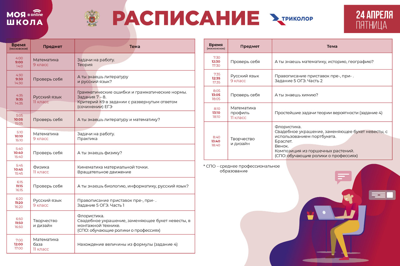 Расписание на 24 апреля трансляции телевизионного образовательного проекта Минпросвещения России «МОЯ ШКОЛА в online».