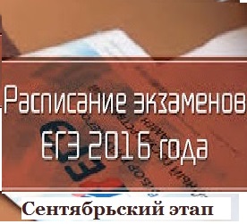 30.08.2016Согласно расписанию проведения единого государственного экзамена и государственного выпускного экзамена, в 2016 году в сентябре экзамены пройдут, ЕГЭ: русский язык – 5 сентября, математика Б – 8 сентября, русский язык, математика – 14 сентября; ГВЭ: русский язык – 5 сентября, математика – 8 сентября, русский язык, математика – 14 сентября; ОГЭ, ГВЭ: математика – 5 сентября, русский язык – 12 сентября, математика, русский язык – 15 сентября.