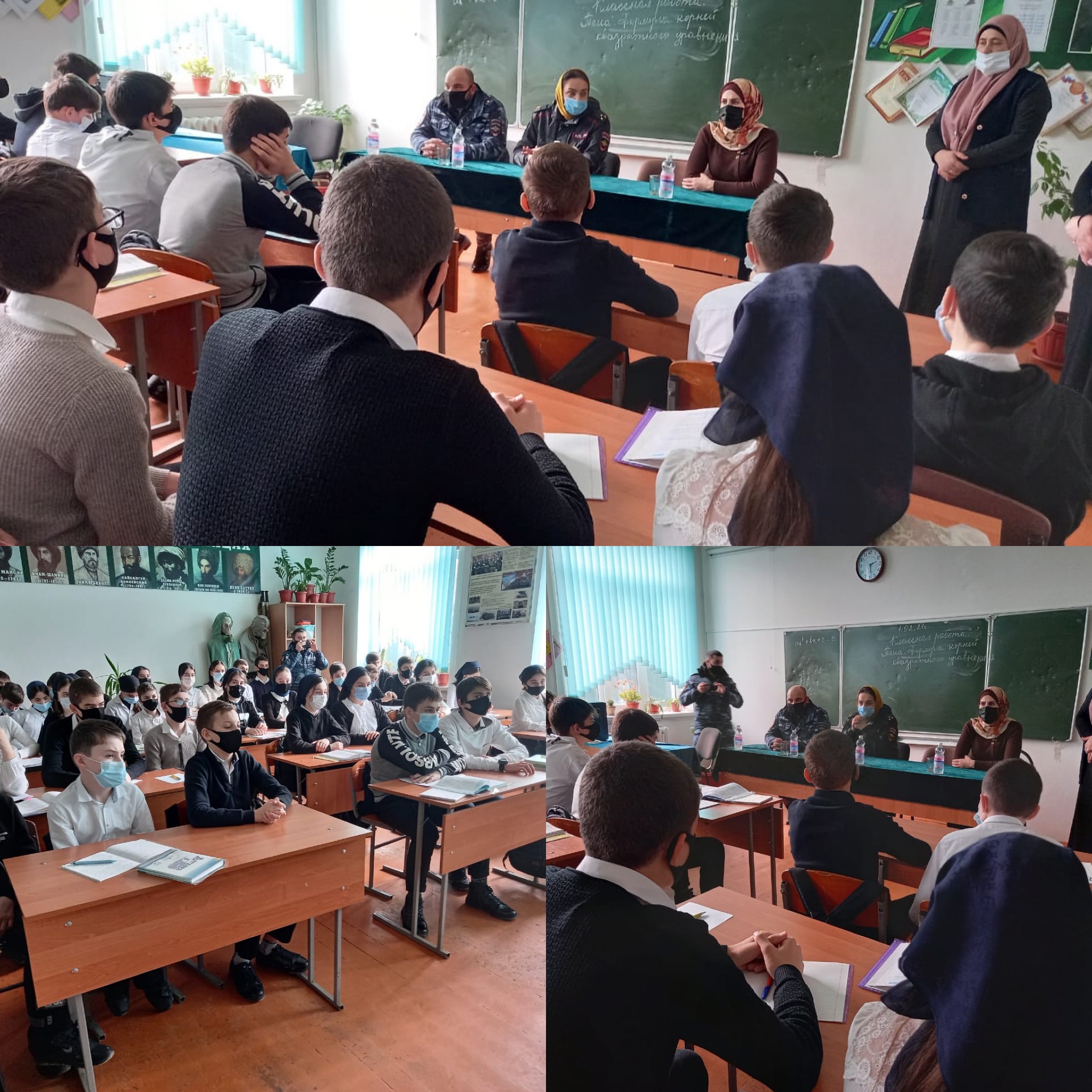 03.02.2021Совместно с начальником ОПДН ОМВД по Ачхой-Мартановскому району Абдулкадыровым И. А., старшим инспектором Итаевой Т. А. и руководством школы с обучающимися 8-11 классов проведена беседа по теме: «Соблюдение масочного режима и профилактических мер против заболевания COVID-19»