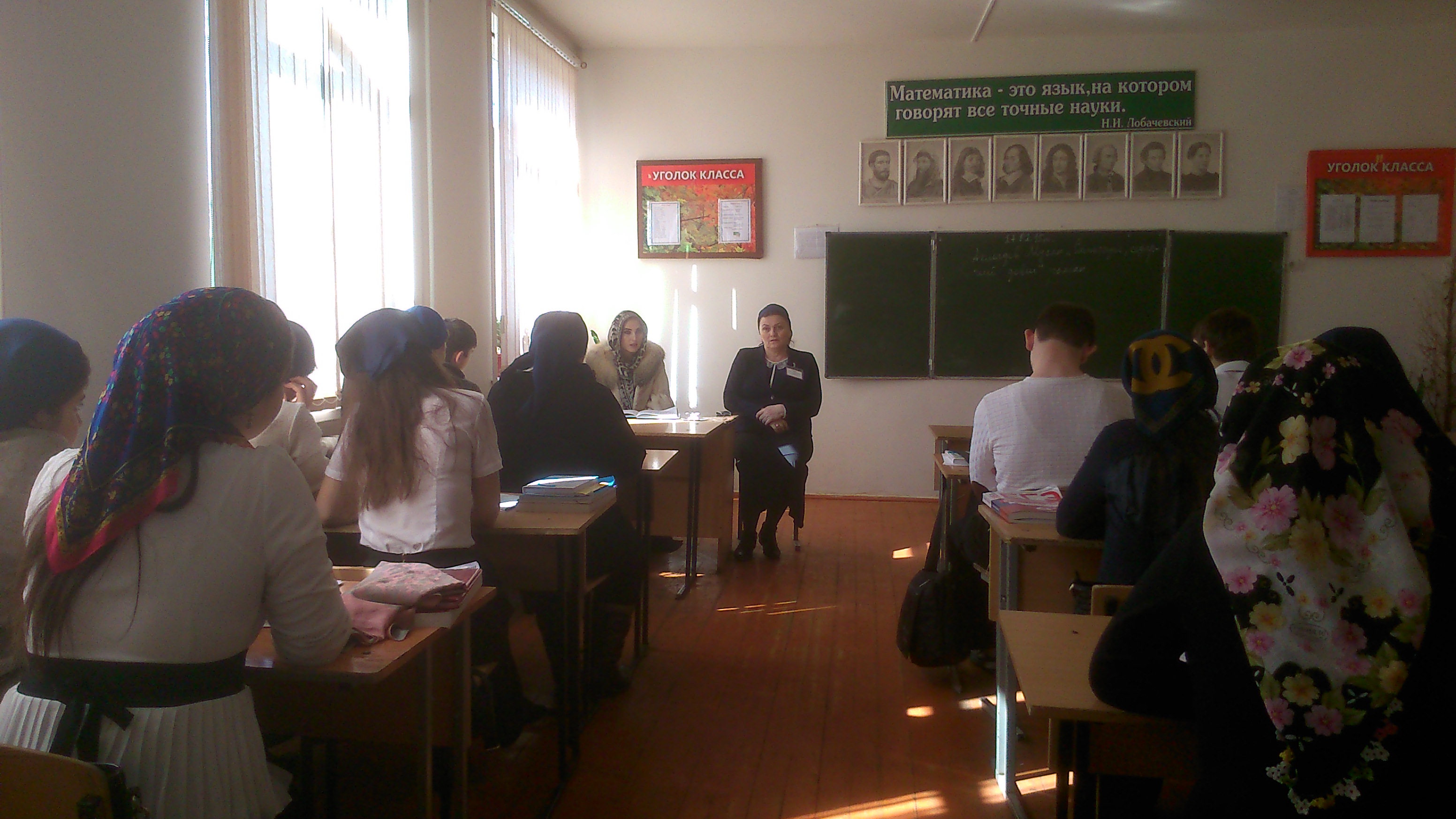 27.02.201527 февраля в МБОУ "СОШ №6 с. Ачхой-Мартан" прошла встреча обучающихся 11 класса с главным специалист-экспертом отдела территориальных представителей Министерства ЧР по делам молодежи А.Исаевой. В ходе встречи обсуждались такие темы, как: успешная сдача экзаменов, выбор будущей профессии, воспитание чувства долга и ответственности перед Отечеством.