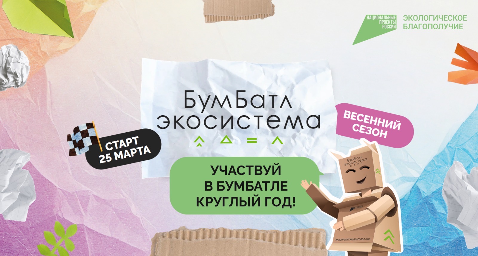 Всероссийская акция по сбору макулатуры «БумБатл» проходит в поддержку национального проекта «Экологическое благополучие». Организаторы проекта: АНО «Национальные приоритеты», Движение «Экосистема» при поддержке Минприроды России. За 5 сезонов«БумБатла» в нем приняли участие 9 млн человек, которые собрали 305 тыс. тонн макулатуры.