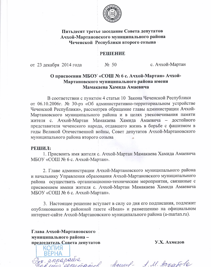 09.04.2015Уважаемые посетители сайта! Обращаем Ваше внимание на тот факт, что на основании решения Администрации Ачхой-Мартановского района от 23.12.2014 г. №50 МБОУ "СОШ №6 с. Ачхой-Мартан" переименовано в муниципальное бюджетное общеобразовательное учреждение "Средняя общеобразовательная школа №6 им. Х.А. Мамакаева с. Ачхой-Мартан" (МБОУ "СОШ №6 им. Х.А.Мамакаева с. Ачхой-Мартан".